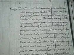 The Hetmanate used Polish currency, and Polish was frequently used as the language of administration and even of command.[45] However, after the Truce of Andrusovo in 1667, the "simple language" (Ukrainian: проста мова), or the commonly spoken vernacular language of Ukraine, began to be written down and widely used in official documents of the Cossack Hetmanate.[46]