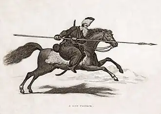 Western Europeans had a lot of contact with Cossacks during the Seven Years' War, and had seen Cossack patrols in Berlin.[72] During Napoleon's Invasion of Russia, Cossacks were the Russian soldiers most feared by the French troops. Napoleon himself stated, "Cossacks are the best light troops among all that exist. If I had them in my army, I would go through all the world with them."[73] Cossacks also took part in the partisan war deep inside French-occupied Russian territory, attacking communications and supply lines. These attacks, carried out by Cossacks along with Russian light cavalry and other units, were one of the first developments of guerrilla warfare tactics and, to some extent, special operations as we know them today. Several thousands of Cossacks were commended by Pyotr Bagration during the French invasion of Russia behind Bug.[74]