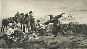Max Vasmer's etymological dictionary traces the name to the Tatar Turkic word kazak, kozak, in which cosac meant 'free man' but also 'conqueror'.[11] The ethnonym Kazakh is from the same Turkic root.[12][13][14]