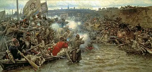 The Ural Cossack Host was formed from the Ural Cossacks, who had settled along the Ural River. Their alternative name, Yaik Cossacks, comes from the river's former name, changed by the government after Pugachev's Rebellion of 1773–1775. The Ural Cossacks spoke Russian, and identified as having primarily Russian ancestry, but also incorporated many Tatars into their ranks.[78] In 1577, twenty years after Moscow had conquered the Volga from Kazan to Astrakhan,[79] the government sent troops to disperse pirates and raiders along the Volga. Among them was Yermak Timofeyevich. Some escaped to flee southeast to the Ural River, where they joined the Yaik Cossacks. In 1580, they captured Saraichik. By 1591, they were fighting on behalf of the government in Moscow. Over the next century, they were officially recognized by the imperial government.