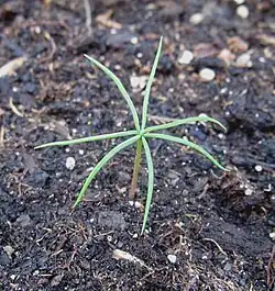 Gymnosperm seedlings also have cotyledons. Gnetophytes, cycads, and ginkgos all have 2, whereas in conifers they are often variable in number (multicotyledonous), with 2 to 24 cotyledons forming a whorl at the top of the hypocotyl (the embryonic stem) surrounding the plumule. Within each species, there is often still some variation in cotyledon numbers, e.g. Monterey pine (Pinus radiata) seedlings have between 5 and 9, and Jeffrey pine (Pinus jeffreyi) 7 to 13 (Mirov 1967), but other species are more fixed, with e.g. Mediterranean cypress always having just two cotyledons. The highest number reported is for big-cone pinyon (Pinus maximartinezii), with 24 (Farjon & Styles 1997).