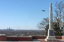Oakland-Fairview developed during the 1890s and features a wealth of 19th-century architecture, including the Judge Finley Burke mansion at 510 Oakland built in 1893 out of Minnesota granite. The neighborhood is also home to the Lincoln Monument. Located at the western end of Lafayette Avenue, the monument was erected in 1911 by the local chapter of the Daughters of the American Revolution that, according to folklore, commemorates the spot where Abraham Lincoln decided on the location of the transcontinental railroad in 1859. The monument offers expansive views across the West End in the Missouri River Valley to Omaha, Nebraska. Nearby is the entrance to Fairview Cemetery, situated on the north side of Lafayette Avenue, which predates the establishment of the present city and includes the Kinsman Monument and the burial place of many early settlers, including Amelia Bloomer. At the east end of Lafayette Avenue where it intersects with North Second Street stands the Ruth Anne Dodge Memorial, the "Black Angel" designed by Daniel Chester French, although the wife of Grenville Dodge is actually buried elsewhere in Council Bluffs.