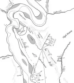 Sauganash's English name was Billy Caldwell, and his village was called Caldwell's Camp. The tribe were sometimes called the Bluff Indians. U.S. Army dragoons built a small fort nearby.