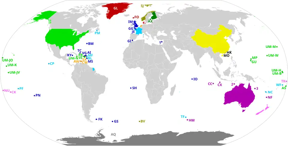 - ^ Each territory in the United States Minor Outlying Islands is labeled UM- followed by the first letter of its name and another unique letter if needed.