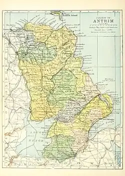 - ^ a b c d e f g h i One or more of the preceding sentences incorporates text from a publication now in the public domain: Chisholm, Hugh, ed. (1911). "Antrim (county)". Encyclopædia Britannica. Vol. 2 (11th ed.). Cambridge University Press. pp. 152–154.
