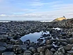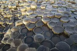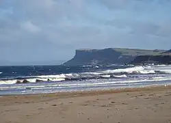 A large portion of Antrim is hilly, especially in the east, where the highest elevations are attained. The range runs north and south, and, following this direction, the highest points are Knocklayd 514 m (1,690 ft), Slieveanorra 508 m (1,670 ft), Trostan 550 m (1,800 ft), Slemish 437 m (1,430 ft), Agnew's Hill 474 m (1,560 ft) and Divis 478 m (1,570 ft).[10] The inland slope is gradual, but on the northern shore the range terminates in abrupt and almost perpendicular declivities, and here, consequently, some of the finest coast scenery in the world is found, widely differing, with its unbroken lines of cliffs, from the indented coast-line of the west. The most remarkable cliffs are those formed of perpendicular basaltic columns, extending for many miles, and most strikingly displayed in Fair Head and the celebrated Giant's Causeway. From the eastern coast, the hills rise instantly but less abruptly, and the indentations are wider and deeper. On both coasts there are several resort towns, including Portrush (with well-known golf links), Portballintrae and Ballycastle; on the east Cushendun, Cushendall and Waterfoot on Red Bay, Carnlough and Glenarm, Larne on the Sea of Moyle, and Whitehead on Belfast Lough. All are somewhat exposed to the easterly winds prevalent in spring. The only island of size is the L-shaped Rathlin Island, off Ballycastle, 11 km (6.8 mi) in total length by 2 km (1.2 mi) maximum breadth, 7 km (4.3 mi) from the coast, and of similar basaltic and limestone formation to that of the mainland. It is partially arable and supports a small population. Islandmagee is a peninsula separating Larne Lough from the North Channel.[11]