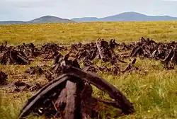 The forested area in the county extends to 55,534 ha (137,228 acres), the 4th highest total forest cover in Ireland.[29] Historic deforestation left Donegal devoid of forest cover by 1900. Much of the county's forests are commercial timber plantations which were initially established in the 1930s as a way to create rural employment in areas with poor agricultural land and high rates of emigration.[30] The county contains extensive tracts of blanket bog which are concentrated in western and upland regions. Blanket bog covers an area of 148,656 ha (367,337 acres), or roughly 30 percent of the entire county.[31]