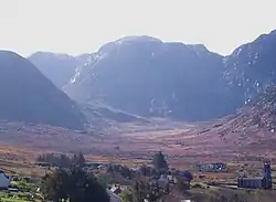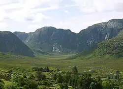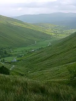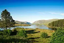 The county's landscape was carved out by glaciation at the end of the Pleistocene and the subsequent retreat during the early Holocene. Donegal contains one of Ireland's three glacial fjords (or fjards) at Lough Swilly, the others being Carlingford Lough and Killary Harbour.[51] Lough Swilly is the county's largest inlet and forms the western boundary of the Inishowen Peninsula. The thick ice sheet that once covered the region carved out deep basins in the Donegal uplands and many tarns or corrie lakes developed in these depressions after the ice had melted, including Lough Maam below Slieve Snaght and Lough Feeane under Aghla More. Larger glacial lakes formed in the county's distinctive U-shaped valleys, such as Lough Beagh and Gartan Lough in Glenveagh, and Dunlewey Lough and Lough Nacung Upper in the Poisoned Glen. Valleys such as these were the last areas to retain glaciers as temperatures rose.[52]