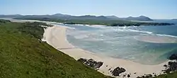 As the ice sheet thinned, topography became the dominant force driving the direction of ice and meltwater flow.[53] Erosion by glacial meltwater carved out large channels in southern Donegal which directed water and sediment to outwash fans in Donegal Bay. The area south of Donegal town, where the River Eske flows into the bay, is an example of one of these outwash areas. Sea levels in the area began to stabilise around 5,000 years ago, and the balance of erosion and deposition along Donegal's coastline resulted in the development of many sandy beaches and spits interspersed with jagged sea cliffs.[54]