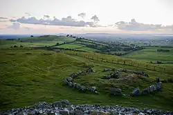 Meath is largely flat and much of the county lies below 100 m (330 ft) above sea-level. The minor hills in the far west of the county at Loughcrew, and in the north at Carrickleck are the only upland areas of any significance. Slieve na Calliagh, at just 276 m (906 ft) in height, is the highest point in the county, making it the second lowest county top in Ireland. Carrickleck Hill, near the Cavan border, is the second highest peak in Meath, at 173 m (568 ft).[15] The Hill of Tara is located south of Navan and, although just 155 m (509 ft) in height, is the most prominent feature in the local topography, commanding a panoramic view of the surrounding area.