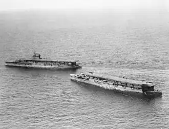 A two-storey hangar was built under the flight deck, each level being 15 ft (4.6 m) high. The lower hangar was 550 ft (167.6 m) long by 35–50 ft (10.7–15.2 m) wide and the upper was 520 by 50 ft (158.5 by 15.2 m). Each hangar could be sectioned off by electrically operated steel shutters on rollers. Her boilers were ducted down the side of the ship to exhaust either out of gratings at the rear of the flight deck, or, when landing operations were in progress, out of the side of the lower hangar at the rear of the ship. This solution proved to be very unsatisfactory as it consumed valuable space, made parts of the lower hangar unbearable and interfered with landing operations to a greater or lesser degree. Her original flying-off deck remained in place for use by small aircraft like fighters so that the ship could simultaneously land aircraft on the main flight deck while fighters were taking off on the lower deck and could speedily launch her aircraft from both decks. Doors at the forward end of the upper hangar opened onto the lower flying deck.[7] Two 47-by-46-foot (14.3 by 14.0 m) lifts (elevators) were installed to transfer aircraft between the flight deck and hangars. Two 600-imperial-gallon (2,700 L; 720 US gal) ready-use petrol tanks were provided for aircraft and the ship's boats on the upper deck. An additional 20,000 imperial gallons (91,000 L; 24,000 US gal) of petrol were in bulk storage. The longitudinal arresting gear proved unpopular in service and it was ordered removed in 1927 after tests aboard Furious in 1926 had shown that deck-edge palisades were effective in reducing cross-deck gusts that could blow aircraft over the side.[8] Furious's long exhaust ducting hampered landing operations, and restricted the size of the hangars and thus the number of aircraft that she could carry.[9]