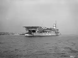 The ship was reduced to reserve status on 1 July 1930 in preparation for a lengthy overhaul at Devonport from September 1930 to February 1932, focused on refitting her machinery and re-tubing her boilers.[39] In addition her quarterdeck was raised by one deck, the AA armament was revised and water spraying facilities were fitted in the hangars.[40] Upon completion she ran a full-power trial on 16 February 1932 where her maximum speed was 28.8 kn (53.3 km/h; 33.1 mph) from a total of 89,754 shp (66,930 kW).[39]