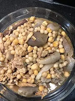 In the Levant, the dish known as moghrabieh (Arabic: مغربية, lit. 'Maghrebi', a reference to the Maghreb region) uses the same durum-based semolina flour but rolled into larger (5–6 mm or 31614 in in diameter) 'pearls' to create a dish that is commonly served across Jordan, Lebanon and Syria.[43] The pearls are either cooked as part of a stew or flavored with cinnamon and served alongside a chicken and chickpea broth.[44][45]