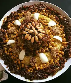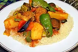Algerian couscous is a traditional staple food in Algeria, and it plays an important role in Algerian culture and cuisine. It is commonly served with vegetables, meat, or fish. In Algeria, there are various types of couscous dishes.[17]