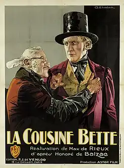 Balzac's novel has been adapted several times for the screen. The first was in 1928, when French filmmaker Max DeRieux directed Alice Tissot in the title role.[111] Margaret Tyzack played the role of Bette in the five part serial Cousin Bette made in 1971 by the BBC, which also starred Helen Mirren as Valérie Marneffe.[112] The film Cousin Bette was released in 1998, directed by Des McAnuff. Jessica Lange starred in the title role, joined by Bob Hoskins as Crevel, and Elisabeth Shue as the singer Jenny Cadine. Screenwriters Lynn Siefert and Susan Tarr changed the story significantly, and eliminated Valérie. The 1998 film was panned by critics for its generally poor acting and awkward dialogue. Stephen Holden of The New York Times commented that the movie "treats the novel as a thoroughly modern social comedy peopled with raging narcissists, opportunists and flat-out fools".[113][114] The 1998 film changed the novel quite drastically, retaining the basic idea of Bette avenging herself on her enemies, and not only eliminating Valerie, but letting Bette survive at the end.