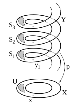 The open sets are called sheets, which are uniquely determined up to homeomorphism if is connected.[2]: 56 For each the discrete set is called the fiber of . If is connected (and is non-empty), it can be shown that is surjective, and the cardinality of is the same for all ; this value is called the degree of the covering. If is path-connected, then the covering is called a path-connected covering. This definition is equivalent to the statement that is a locally trivial fiber bundle.