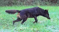The coyote is typically smaller than the gray wolf, but has longer ears and a relatively larger braincase,[7] as well as a thinner frame, face, and muzzle. The scent glands are smaller than the gray wolf's, but are the same color.[9] Its fur color variation is much less varied than that of a wolf.[13] The coyote also carries its tail downwards when running or walking, rather than horizontally as the wolf does.[14]