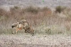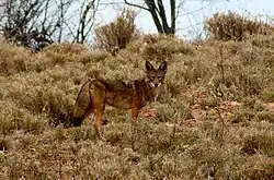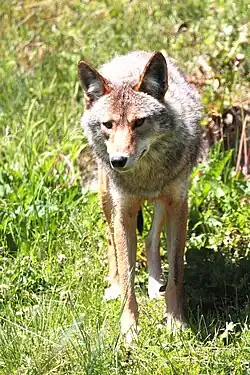 The coyote (Canis latrans) is a species of canine also known as the American jackal, prairie wolf, and brush wolf. It is native to North America, and it is smaller than its close relative, the gray wolf, and slightly smaller than the closely related eastern wolf and red wolf. It fills much of the same ecological niche as the golden jackal does in Eurasia; however, the coyote is generally larger.