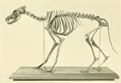 The oldest fossils that fall within the range of the modern coyote date to 0.74–0.85 Ma (million years) in Hamilton Cave, West Virginia; 0.73 Ma in Irvington, California; 0.35–0.48 Ma in Porcupine Cave, Colorado, and in Cumberland Cave, Pennsylvania.[54] Modern coyotes arose 1,000 years after the Quaternary extinction event.[55] Compared to their modern Holocene counterparts, Pleistocene coyotes (C. l. orcutti) were larger and more robust, likely in response to larger competitors and prey.[55] Pleistocene coyotes were likely more specialized carnivores than their descendants, as their teeth were more adapted to shearing meat, showing fewer grinding surfaces suited for processing vegetation.[56] Their reduction in size occurred within 1,000 years of the Quaternary extinction event, when their large prey died out.[55] Furthermore, Pleistocene coyotes were unable to exploit the big-game hunting niche left vacant after the extinction of the dire wolf (Aenocyon dirus), as it was rapidly filled by gray wolves, which likely actively killed off the large coyotes, with natural selection favoring the modern gracile morph.[56]