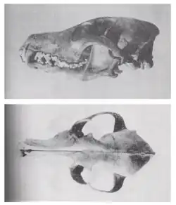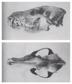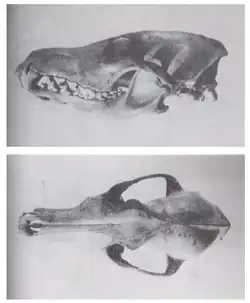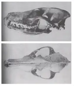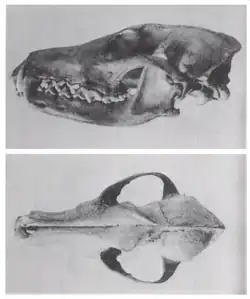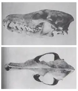 C. latrans and C. aureus are closely related to C. edwardii, a species that appeared earliest spanning the mid-Blancan (late Pliocene) to the close of the Irvingtonian (late Pleistocene), and coyote remains indistinguishable from C. latrans were contemporaneous with C. edwardii in North America.[50] Johnston describes C. lepophagus as having a more slender skull and skeleton than the modern coyote.[51] Ronald Nowak found that the early populations had small, delicate, narrowly proportioned skulls that resemble small coyotes and appear to be ancestral to C. latrans.[52]