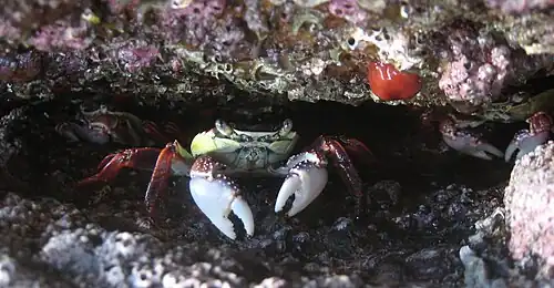 - ^ Kennish, R; Williams, G. A. (1997). "Feeding preferences of the herbivorous crab Grapsus albolineatus: the differential influence of algal nutrient content and morphology". Marine Ecology Progress Series. 147: 87–95. Bibcode:1997MEPS..147...87K. doi:10.3354/meps147087.