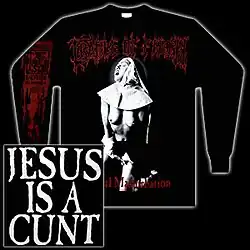 The increasingly theatrical stage shows of the 1997 European tour helped keep Cradle in the public eye, as did a burgeoning line of controversial merchandise, not least the notorious T-shirt depicting a masturbating nun on the front and the slogan "Jesus is a cunt" in large letters on the back. The T-shirt is banned in New Zealand,[9] a handful of fans have faced court appearances and fines for wearing the shirt in public, and some band members themselves attracted a certain amount of hostile attention when they wore similar "I Love Satan" shirts to the Vatican.[10] Alex Mosson, the Lord Provost of Glasgow from 1999 to 2003, called the shirts (and by implication the band) "sick and offensive". The band used the quote on the back cover of the 2005 DVD Peace Through Superior Firepower.