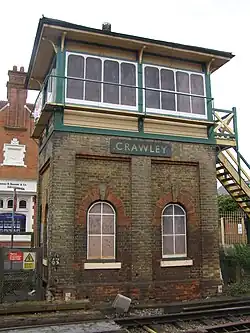 The Brighton Main Line was the first railway line to serve the Crawley area. A station was opened at Three Bridges (originally known as East Crawley)[29] in the summer of 1841. Crawley railway station, at the southern end of the High Street, was built in 1848 when the Horsham branch was opened from Three Bridges to Horsham. A line was built eastwards from Three Bridges to East Grinstead in 1855. The village of Three Bridges had become the hub of transport in the area by this stage: one-quarter of its population was employed in railway jobs by 1861, mainly at the London, Brighton and South Coast Railway's railway works near the station.[30] The Longley company—one of South East England's largest building firms in the late 19th century, responsible for buildings including Christ's Hospital school and King Edward VII Sanatorium in Midhurst—moved to a site next to Crawley station in 1881.[31] In 1898 more than 700 people were employed at the site.[32]
