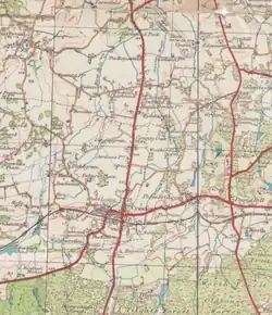 Crawley lies in the Low Weald, on the edge of the High Weald between the North and South Downs. The town centre lies on a gentle slope 67 metres (220 ft) above sea level where the High Street meets Kilnmead, rising to 77 metres (253 ft) above sea level where the High Street meets the railway line.[69] The highest point in the borough is 148 metres (486 ft) above sea level.[70] This forms part of the Forest Ridge of the High Weald, which extends eastwards through the north of Sussex into Tunbridge Wells and Cranbrook in Kent. Two beds of sedimentary rock meet beneath the town: the eastern neighbourhoods and the town centre lie largely on the sandstone Hastings Beds, while the rest of the town is based on Weald Clay.[71][72] A geological fault running from east to west has left an area of Weald Clay (with a ridge of limestone) jutting into the Hastings Beds around Tilgate.[72] The town has no major waterways, although the River Mole rises near Rusper. meeting the Ifield Stream in the north of Crawley, and the Gatwick Stream near Gatwick Airport, before continuing northwards to the River Thames at Hampton Court Palace. There are several lakes at Tilgate Park and a mill pond at Ifield which was stopped to feed the Ifield Water Mill.[73] To the south-west of the town lies St Leonard's Forest, including Buchan Country Park; to the south-east is Tilgate Forest, originally part of Worth Forest. This area forms part of the Weald to Waves wildlife corridor, providing a key link between Knepp Wildland and Ashdown Forest, which connects further to coast via the Rivers Adur, Arun and Ouse.[74]
