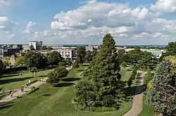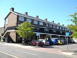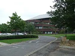 Work began almost immediately to prepare for the expansion of the town. A full master plan was in place by 1949. This envisaged an increase in the population of the town to 50,000, residential properties in nine neighbourhoods radiating from the town centre, and a separate industrial area to the north.[39] The neighbourhoods would consist mainly of three-bedroom family homes, with a number of smaller and larger properties. Each would be built around a centre with shops, a church, a pub, a primary school and a community centre.[40] Secondary education was to be provided at campuses at Ifield Green, Three Bridges and Tilgate.[42] Later, a fourth campus, in Southgate, was added to the plans.[43]
