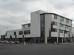 The Urban district council received its coat of arms from the College of Arms in 1957. After the change to borough status a modified coat of arms, based on the original, was awarded in 1976 and presented to the council on 24 March 1977. It features a central cross on a shield, representing the town's location at the meeting point of north–south and east–west roads. The shield bears nine martlets representing both the county of Sussex and the new town's original nine neighbourhoods. Supporters, of an eagle and a winged lion, relate to the significance of the airport to the locality. The motto featured is I Grow and I Rejoice—a translation of a phrase from the Epistulae of Seneca the Younger.[54] Despite a petition to save it,[57] the old Crawley Town Hall, which was built in 1964, was demolished in 2020[58] and a new Crawley Town Hall was completed in 2023.[59]