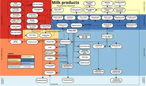Cream is a dairy product composed of the higher-fat layer skimmed from the top of milk before homogenization. In un-homogenized milk, the fat, which is less dense, eventually rises to the top. In the industrial production of cream, this process is accelerated by using centrifuges called "separators". In many countries, it is sold in several grades depending on the total butterfat content. It can be dried to a powder for shipment to distant markets, and contains high levels of saturated fat.[1][2]