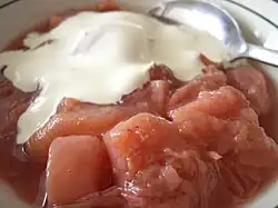 Cream skimmed from milk may be called "sweet cream" to distinguish it from cream skimmed from whey, a by-product of cheese-making. Whey cream has a lower fat content and tastes more salty, tangy, and "cheesy".[3] In many countries partially fermented cream is also sold as: sour cream, crème fraîche, and so on. Both forms have many culinary uses in both sweet and savoury dishes.