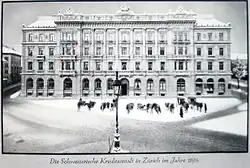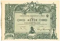 Credit Suisse's founder, Alfred Escher, was called "the spiritual father of the railway law of 1852" for his work defeating the idea of a state-run railway system in Switzerland in favor of privatization.[19][20] Escher founded Credit Suisse (originally called the Swiss Credit Institution, i.e., Schweizerische Kreditanstalt) jointly with Allgemeine Deutsche Credit-Anstalt on 5 July in 1856[21] primarily to provide domestic funding to railway projects, avoiding French banks that wanted to exert influence over the railway system.[22] Escher aimed to start the company with three million shares and instead sold 218 million shares in three days.[23] The bank opened on 16 July 1856 and was modeled after Crédit Mobilier, a bank funding railway projects in France that was founded two years prior, except Credit Suisse had a more conservative lending policy focused on short-to-medium-term loans.[22] In its first year of operation, 25% of the bank's revenues were from the Swiss Northeastern Railway, which was being built by Bruno Hildebrand and Escher's company, Nordostbahn.[24]