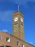 There are two tiers of local government covering Crewe, at civil parish (town) and unitary authority level: Crewe Town Council and Cheshire East Council. The town council is based at 1 Chantry Court on Forge Street.[20] Cheshire East Council also has its main offices in the town, at Delamere House on Delamere Street, with the Municipal Buildings on Earle Street being used for some council meetings.[21] Some outer parts of the built-up area (as defined by the Office for National Statistics) lie outside the parish, notably in the neighbouring parishes of Leighton, Woolstanwood, Wistaston, and Rope.[22][2]