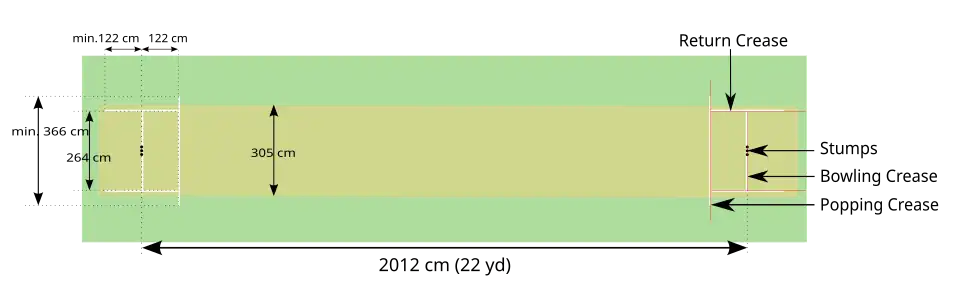 In the approximate centre of the field is a rectangular pitch (see image, below) on which a wooden target called a wicket is sited at each end; the wickets are placed 22 yards (20 m) apart.[78] The pitch is a flat surface 10 feet (3.0 m) wide, with very short grass that tends to be worn away as the game progresses (cricket can also be played on artificial surfaces, notably matting). Each wicket is made of three wooden stumps topped by two bails.[79]