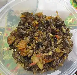 In the southern part of Asia, including Cambodia, Laos, and Thailand, crickets commonly are eaten as a snack, prepared by deep frying soaked and cleaned insects.[53] In Thailand, there are 20,000 farmers rearing crickets, with an estimated production of 7,500 tons per year.[54] The United Nations' Food and Agriculture Organization has implemented a project in Laos to improve cricket farming and, consequently, food security.[55] The food conversion efficiency of house crickets (Acheta domesticus) is 1.7, some five times higher than that for beef cattle, and if their fecundity is taken into account, 15 to 20 times higher.[56][57]