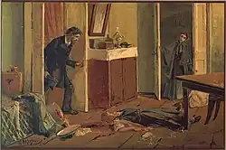 When Raskolnikov presents himself for his interview, Porfiry resumes and intensifies his insinuating, provocative, ironic chatter, without ever making a direct accusation. With Raskolnikov's anger reaching fever pitch, Porfiry hints that he has a "little surprise" for him behind the partition in his office, but at that moment there is a commotion outside the door and a young man (Mikolka the painter) bursts in, followed by some policemen. To both Porfiry and Raskolnikov's astonishment, Mikolka proceeds to loudly confess to the murders. Porfiry does not believe the confession, but he is forced to let Raskolnikov go. Back at his room Raskolnikov is horrified when the old artisan suddenly appears at his door. But the man bows and asks for forgiveness: he had been Porfiry's "little surprise", and had heard Mikolka confess. He had been one of those present when Raskolnikov returned to the scene of the murders, and had reported his behavior to Porfiry.