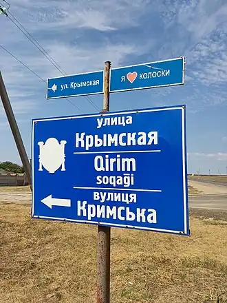 Crimean Tatar Latin script sign in Saky Raion in 2021, along with Russian and Ukrainian