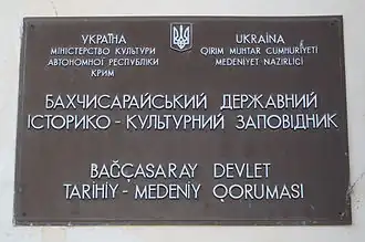 Crimean Tatar Latin script on a plate in Bakhchysarai in 2009, along with Ukrainian