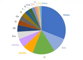 The genetic composition of the Crimean Tatars is primarily constituted by five predominant Y-DNA haplogroups: R1a, R1b, J2, G2a3b1 and E1b1b1, which together account for 67% of the genetic diversity, whereas other haplogroups are classified as minor, each contributing between 1% and 5% to the overall genetic makeup of the Crimean Tatars.[65]