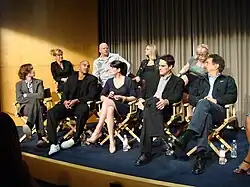 Cast members in 2011–12: (left to right) Gibson, Cook, Gubler, Mantegna, Brewster, and Moore. Absent: Kirsten Vangsness