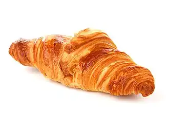 A croissant (/krəˈsɑːnt, ˈk(r)wæsɒ̃/;[1] French: [kʁwasɑ̃] ⓘ) is a French Viennoiserie in a crescent shape made from a laminated yeast dough that sits between a bread and a puff pastry.[2][3]