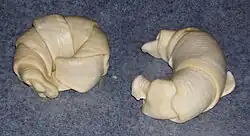It is a buttery, flaky, Viennoiserie inspired by the shape of the Austrian kipferl, but using the French yeast-leavened laminated dough.[4] Croissants are named for their historical crescent shape. The dough is layered with butter, rolled and folded several times in succession, then rolled into a thin sheet, in a technique called laminating. The process results in a layered, flaky texture, similar to a puff pastry.