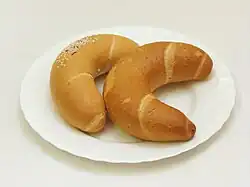 A pastry with croissant shape is the Turkish ay çöreği. It is filled with cinnamon, walnut, hazelnut, cacao and raisin.[29] Its rectangular shape variant is known as pastiç or İzmir çöreği.[30] It is generally eaten during breakfast or with tea.