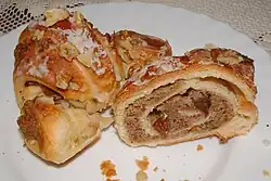 The kipferl, an Austrian crescent-shaped pastry, can be dated back to at least the 13th century in Austria, and came in various shapes.[9][10] The kipferl can be made plain or with nuts or other fillings (some consider the rugelach a form of kipferl).[11]