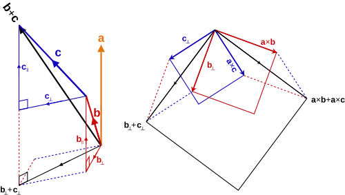 Cross product distributivity over vector addition. Left: The vectors b and c are resolved into parallel and perpendicular components to a. Right: The parallel components vanish in the cross product, only the perpendicular components shown in the plane perpendicular to a remain.[12]