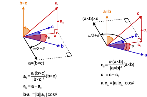 The two nonequivalent triple cross products of three vectors a, b, c. In each case, two vectors define a plane, the other is out of the plane and can be split into parallel and perpendicular components to the cross product of the vectors defining the plane. These components can be found by vector projection and rejection. The triple product is in the plane and is rotated as shown.