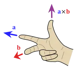 The cross product a × b is defined as a vector c that is perpendicular (orthogonal) to both a and b, with a direction given by the right-hand rule[1] and a magnitude equal to the area of the parallelogram that the vectors span.[2]