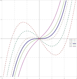 In mathematics, a cubic function is a function of the form that is, a polynomial function of degree three. In many texts, the coefficients a, b, c, and d are supposed to be real numbers, and the function is considered as a real function that maps real numbers to real numbers or as a complex function that maps complex numbers to complex numbers. In other cases, the coefficients may be complex numbers, and the function is a complex function that has the set of the complex numbers as its codomain, even when the domain is restricted to the real numbers.