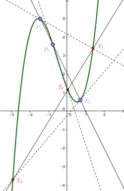 The tangent lines to the graph of a cubic function at three collinear points intercept the cubic again at collinear points.[4] This can be seen as follows.